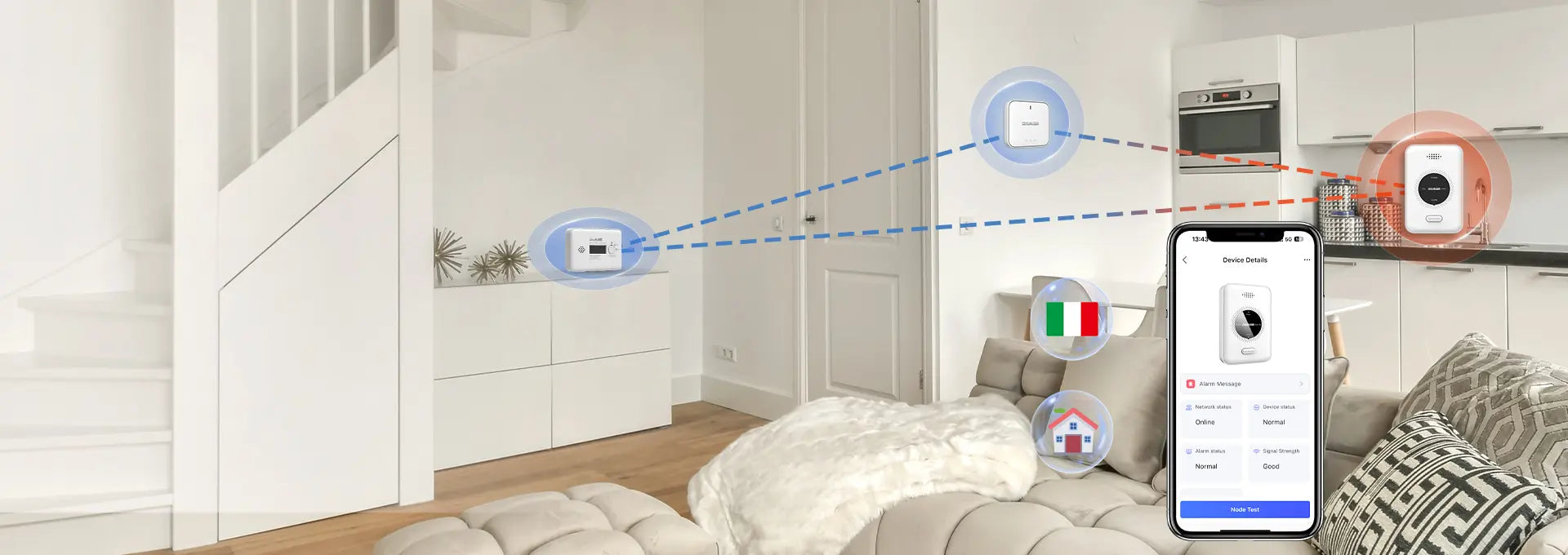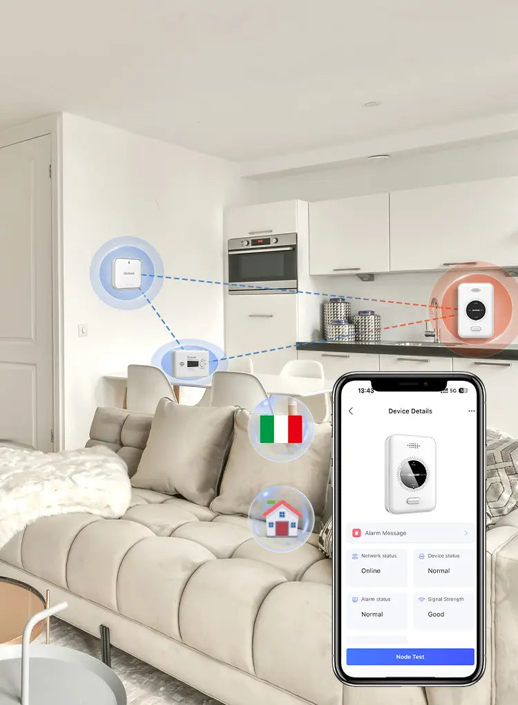 Alarme à distance : via une connexion passerelle, des notifications en temps réel sont envoyées aux applications mobiles des propriétaires/locataires (partageables sur jusqu'à 6 appareils).