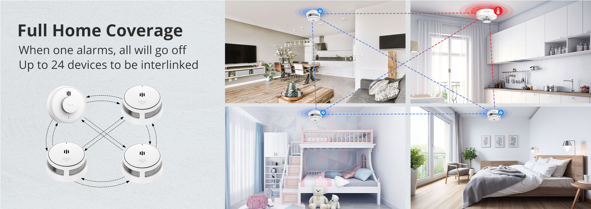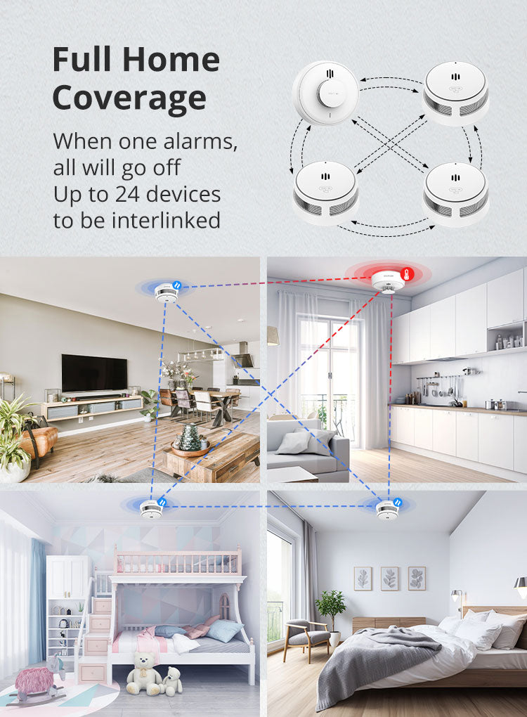 For home use, when the height of the space is less than 8m (3.28 ft), the protection area of a device is20 m²–40 m². So you can judge how many smoke alarms according to how many bedrooms and the area for your home.