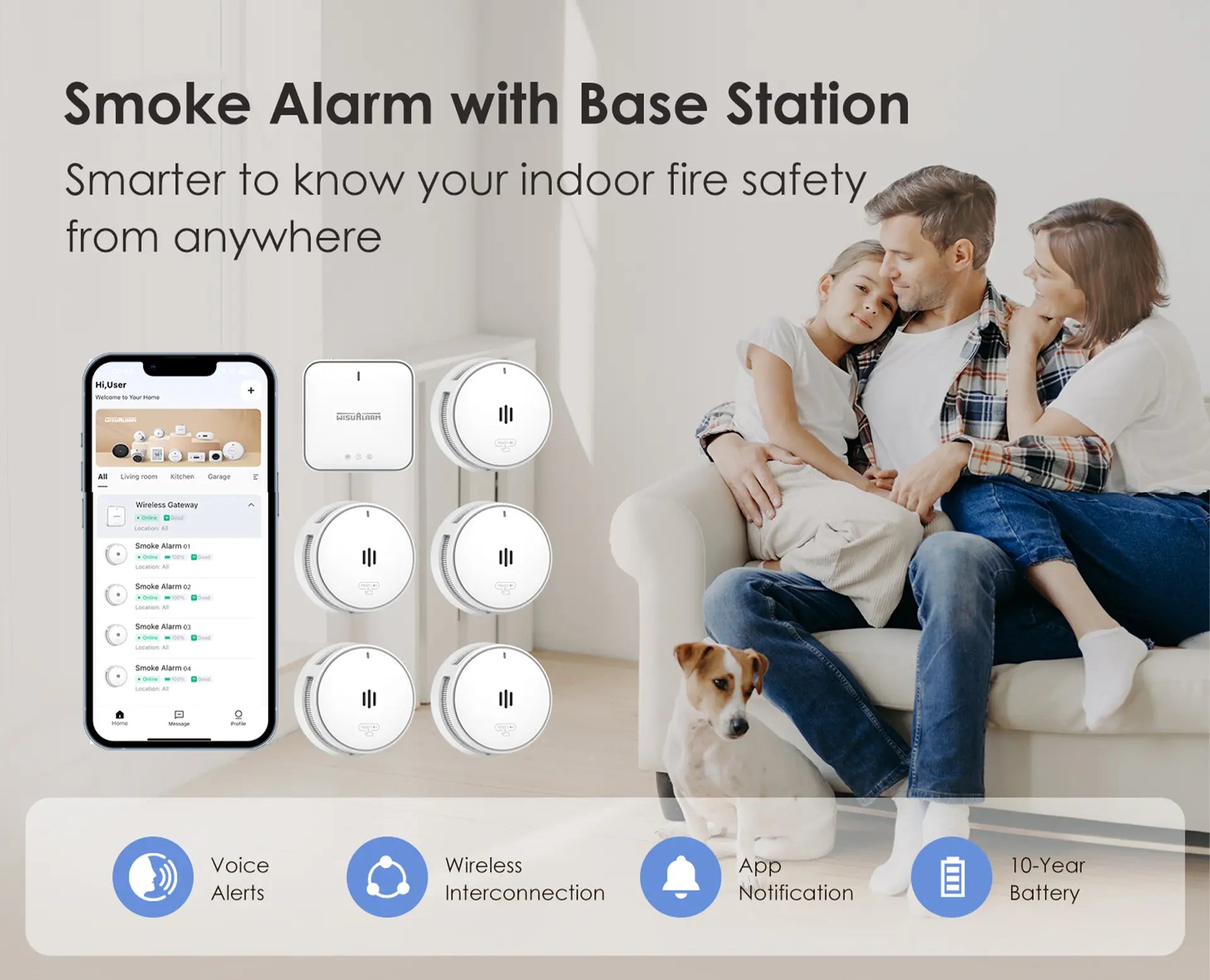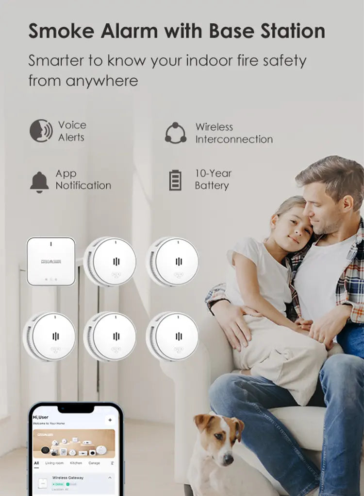 The base station (Wireless Gateway) supports up to 24 devices, including smoke detectors, carbon monoxide detector, heat detector, thermo-hygrometer and water leak detector. which can secure every corner of your home.